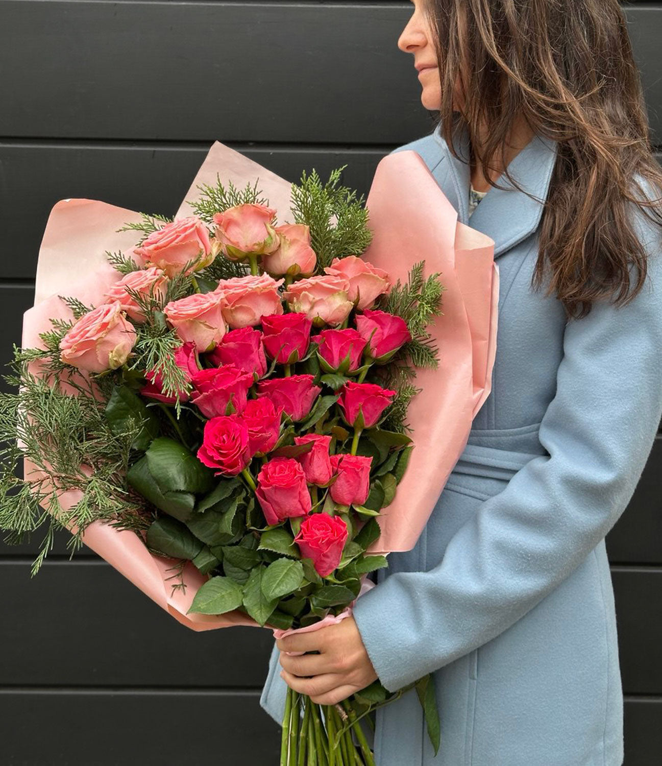 Eternal Affection captures the perfect balance between tenderness and passion — where radiant red roses take the lead beside soft pink blooms, their colors entwined in a graceful dance of love and admiration. Accented with fresh green sprigs, this bouquet feels both lush and uplifting, a living symbol of affection and connection. Ideal for anniversaries, heartfelt gestures, or simply brightening someone’s day, it speaks a language of devotion touched with gentle warmth.