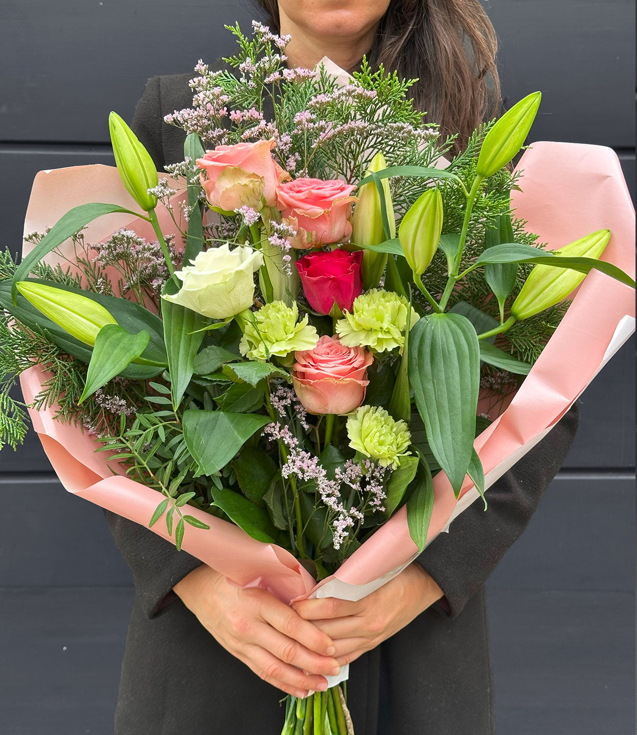Presentation: Expertly hand-tied and wrapped in blush-toned paper, creating a fresh, contemporary look that enhances every bloom. Vase available as an optional upgrade at checkout.