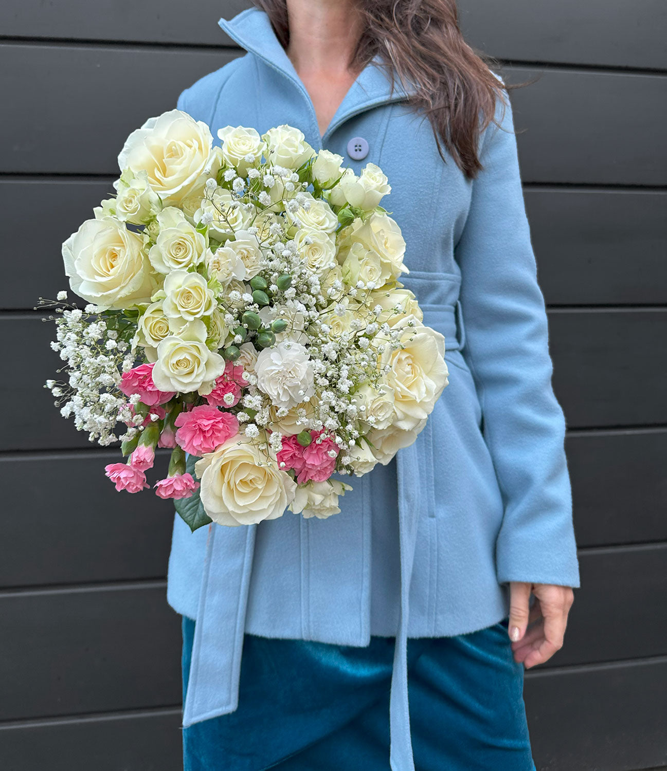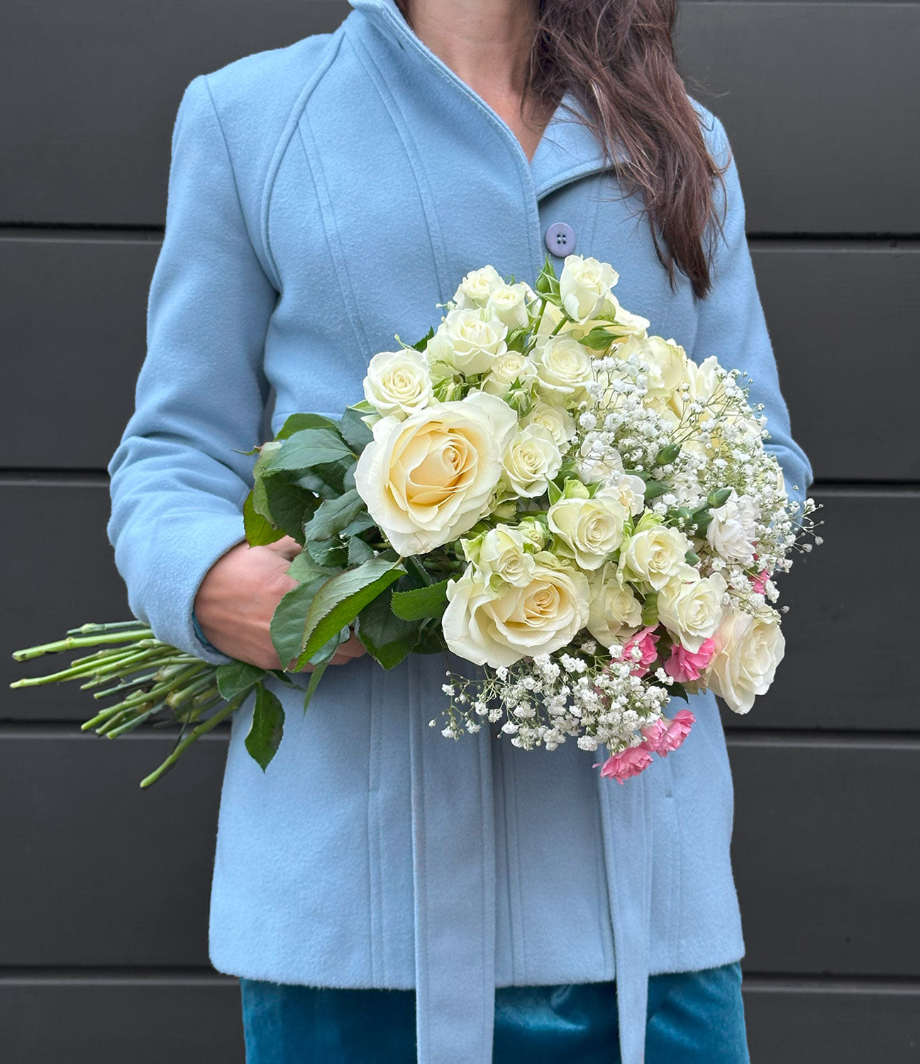 Ivory Embrace captures the essence of grace and warmth — where creamy ivory roses meet delicate touches of pink and clouds of airy white blooms. This bouquet radiates gentle sophistication and tender emotion, blending purity with a hint of playful charm. Perfect for expressing affection, gratitude, or timeless love, it brings light and serenity to any occasion.