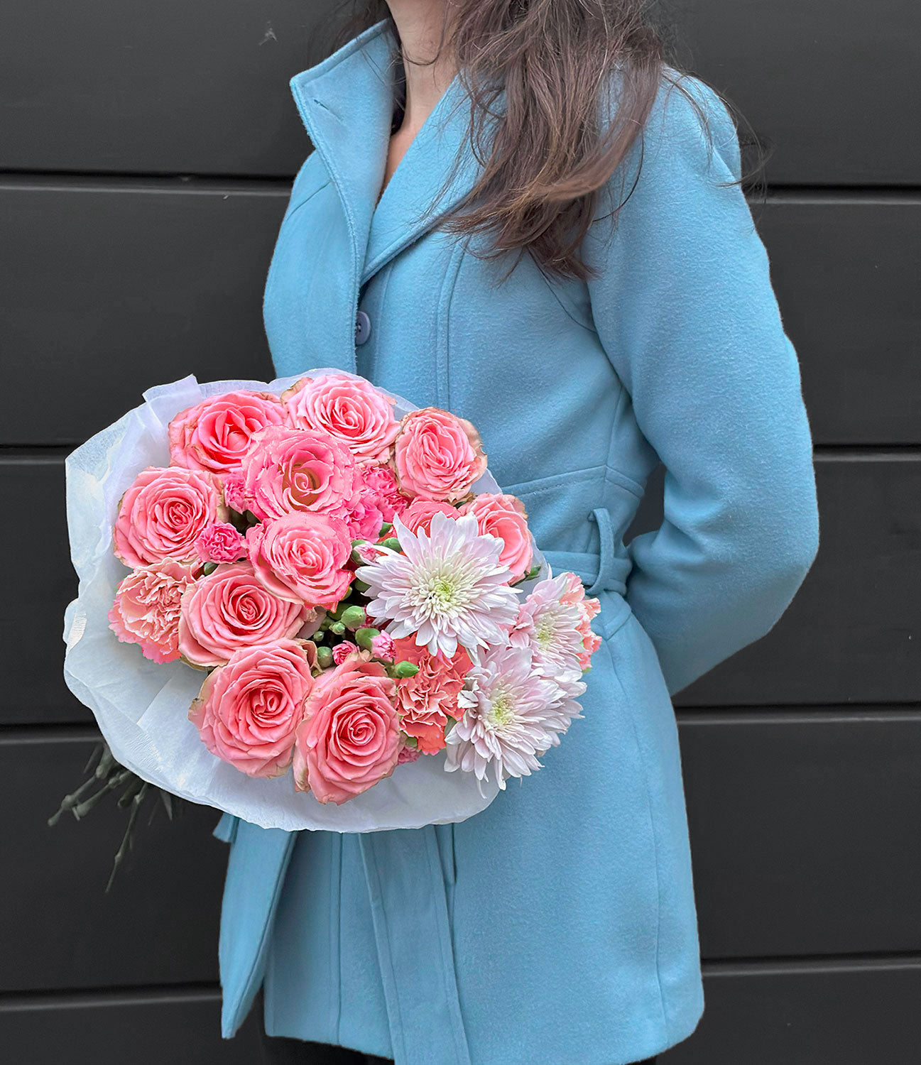 Pink Serenade captures the beauty of tenderness — where warm coral roses meet the soft charm of blush chrysanthemums and the delicate texture of pink carnations. This bouquet exudes grace and warmth, a perfect expression of affection, appreciation, and gentle joy. Each bloom whispers a story of kindness and connection, making it ideal for heartfelt gestures, celebrations, or simply brightening someone’s day.