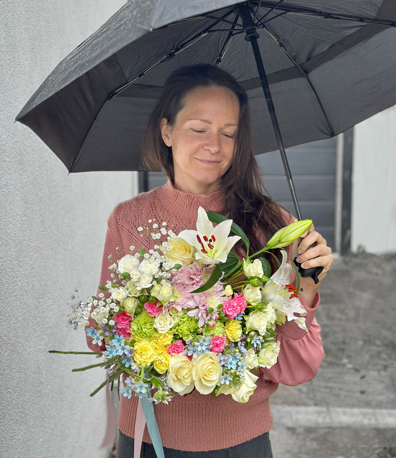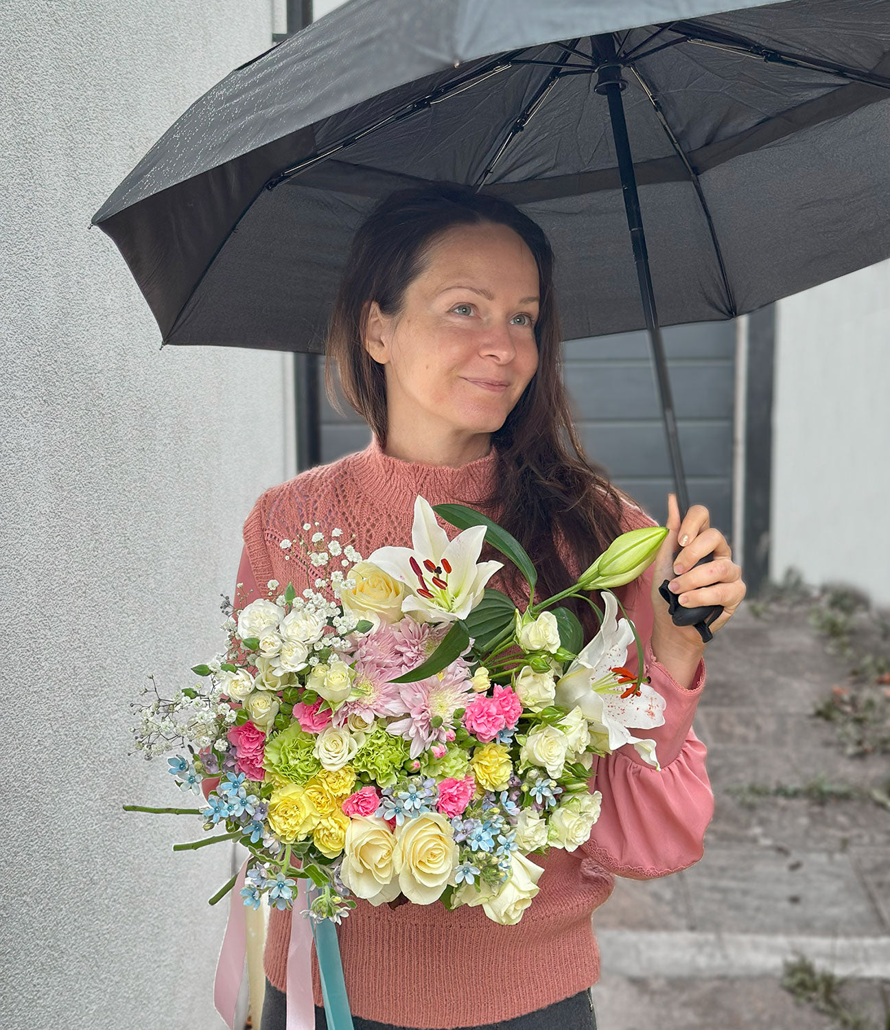 Rainlight hope carries the warmth of sunshine through gentle rain. Even beneath grey skies, this bouquet glows softly — a tender harmony of creamy whites, blush pinks, and sky blues wrapped in refreshing green. Each bloom whispers of resilience and renewal, turning a rainy day into something beautifully bright. Perfect for moments that need a touch of comfort, calm, and quiet joy.